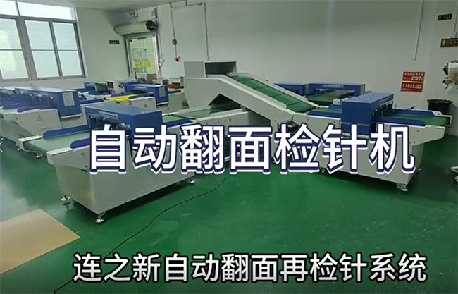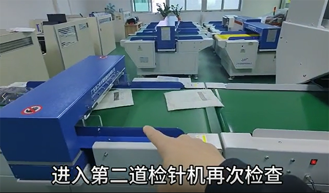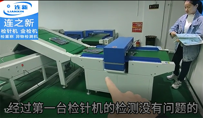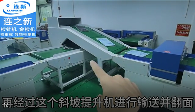 把衣服放進(jìn)檢針機(jī),經(jīng)過(guò)第一臺(tái)檢針機(jī)的檢測(cè)沒(méi)有問(wèn)題后,再經(jīng)過(guò)斜坡提升機(jī)進(jìn)行輸送關(guān)翻面,翻面后,經(jīng)過(guò)輸送機(jī)輸出,進(jìn)入第二道檢針機(jī)再次檢查。