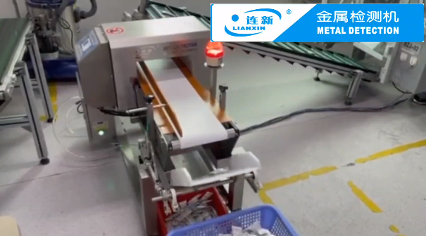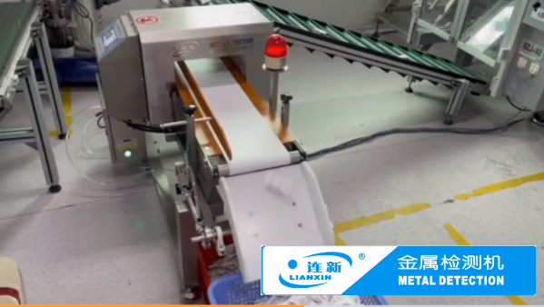 翻板剔除型金檢機(jī)檢測(cè)現(xiàn)場(chǎng):干燥劑金檢機(jī)加裝斜坡提升機(jī)可對(duì)接包裝機(jī),檢測(cè)到金屬后翻板剔除