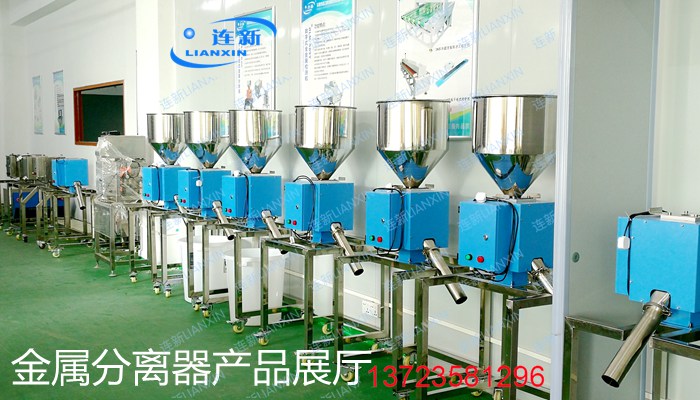 原料從料斗或送料器自由下落進(jìn)入金屬分離器,如果沒有金屬雜質(zhì),原料會(huì)直接通過金屬分離器流向下端的出料口。如果檢測器檢測到原料中含有金屬,那么控制器立刻啟動(dòng)分離板將金屬物和部分原料一起導(dǎo)向側(cè)面的排料口,然后分流板迅速恢復(fù)至正常的位置,分流板速度可調(diào),金屬分離器的檢測精度也可根據(jù)生產(chǎn)需要調(diào)節(jié),最小可檢測并分離出Φ 0.2mm的金屬顆粒。