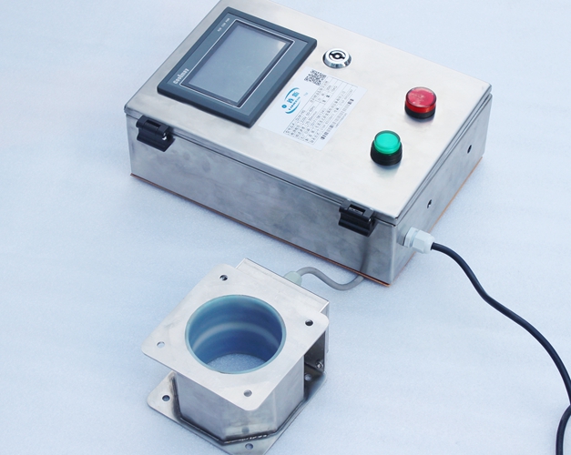 原料從料斗或送料器自由下落進(jìn)入金屬分離器,如果沒有金屬雜質(zhì),原料會直接通過金屬分離器流向下端的出料口。如果檢測器檢測到原料中含有金屬,那么控制器立刻啟動(dòng)分離板將金屬物和部分原料一起導(dǎo)向側(cè)面的排料口,然后分流板迅速恢復(fù)至正常的位置,分流板速度可調(diào),金屬分離器的檢測精度也可根據(jù)生產(chǎn)需要調(diào)節(jié),最小可檢測并分離出Φ 0.2mm的金屬顆粒。