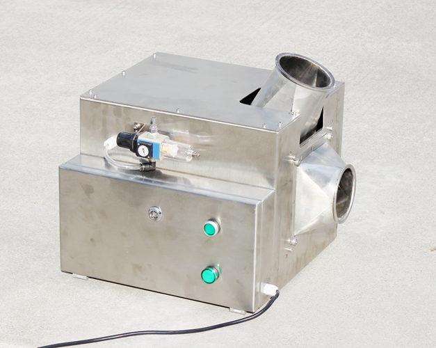 原料從料斗或送料器自由下落進(jìn)入金屬分離器,如果沒有金屬雜質(zhì),原料會(huì)直接通過金屬分離器流向下端的出料口。如果檢測(cè)器檢測(cè)到原料中含有金屬,那么控制器立刻啟動(dòng)分離板將金屬物和部分原料一起導(dǎo)向側(cè)面的排料口,然后分流板迅速恢復(fù)至正常的位置,分流板速度可調(diào),金屬分離器的檢測(cè)精度也可根據(jù)生產(chǎn)需要調(diào)節(jié),最小可檢測(cè)并分離出Φ 0.2mm的金屬顆粒。